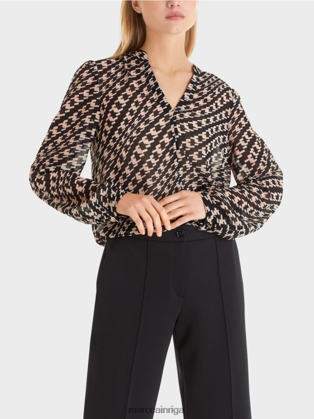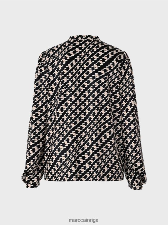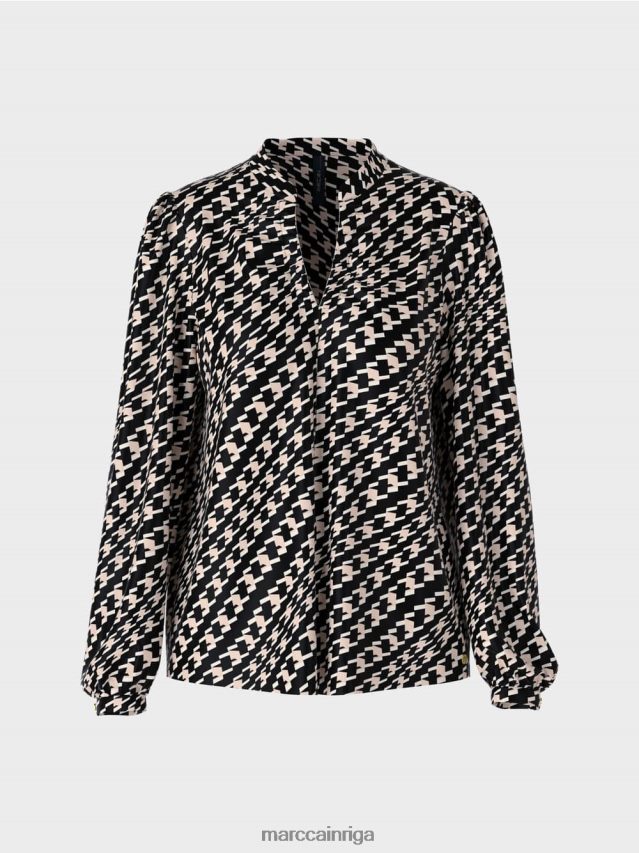 Brīvi Pieguļoša Blūze Ar V-veida Kakla Izgriezumu Un Centrālo šuvi. ģeometriskais Raksts Piešķir šai Blūzei interesantu Izskatu. Tam Ir Brīvs Siluets Un Centrālais šuvums. šauras Aproces Ar Metāla Pogu Un Mazā Stāvapkakle Ar V Veida Kakla Izgriezumu Akcentē Blūzes Dizainu.