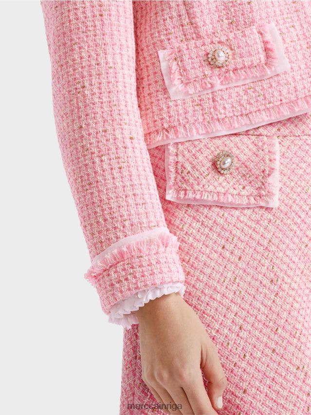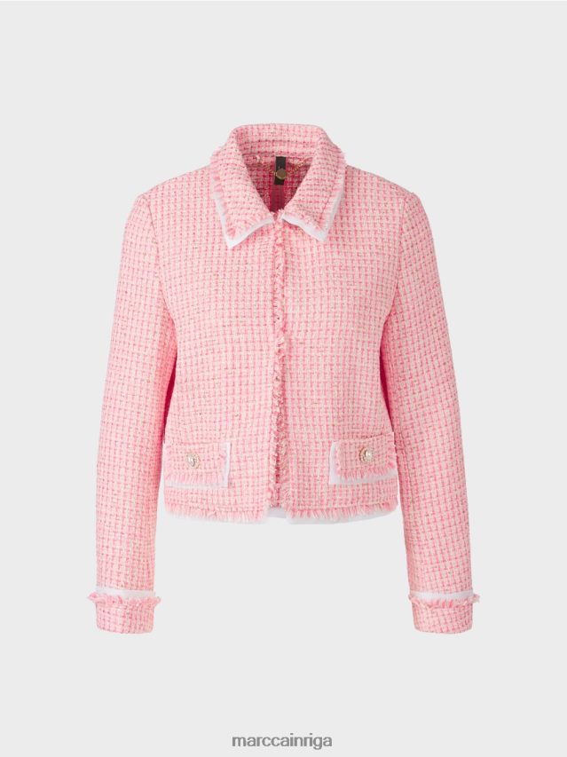 šī Jaka Ir Iedvesmota No Sešdesmito Gadu Stila. Tas Ir Izgatavots No Pušķai Līdzīga Materiāla, Un Tam Mūsdienīgu Pieskaņu Piešķir Vēsās Bārkstis Uz Apkakles, Aizdares Malas, Piedurknēm Un Atlokiem. Imitācijas Atloki Ir Pārklāti Ar Smalku Audumu, Lai Radītu Slāņainu Efektu. Atlokiem Ir Arī Dekoratīvas Pogas, Kas Izgatavotas No Rhinestones Un Pērlītēm, Kas Atbalso Auduma Mirdzošo Dziju.