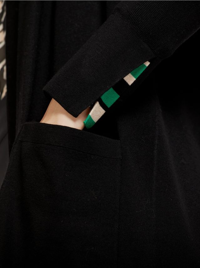 šim Jaciņam, Kas Izgatavots No Tīras Vilnas, Ir Elegants Pieskāriens. Tam Ir Atvērts Dizains Un Ikdienišķs Piegriezums Ar šķēlumiem Sānos. Divas Ielāpu Kabatas Izceļ Relaksētu Komfortu. Piedurkņu Aproces Ar Kontrastējošas Krāsas Svītrainām Detaļām Rada Dekoratīvu Plusu.